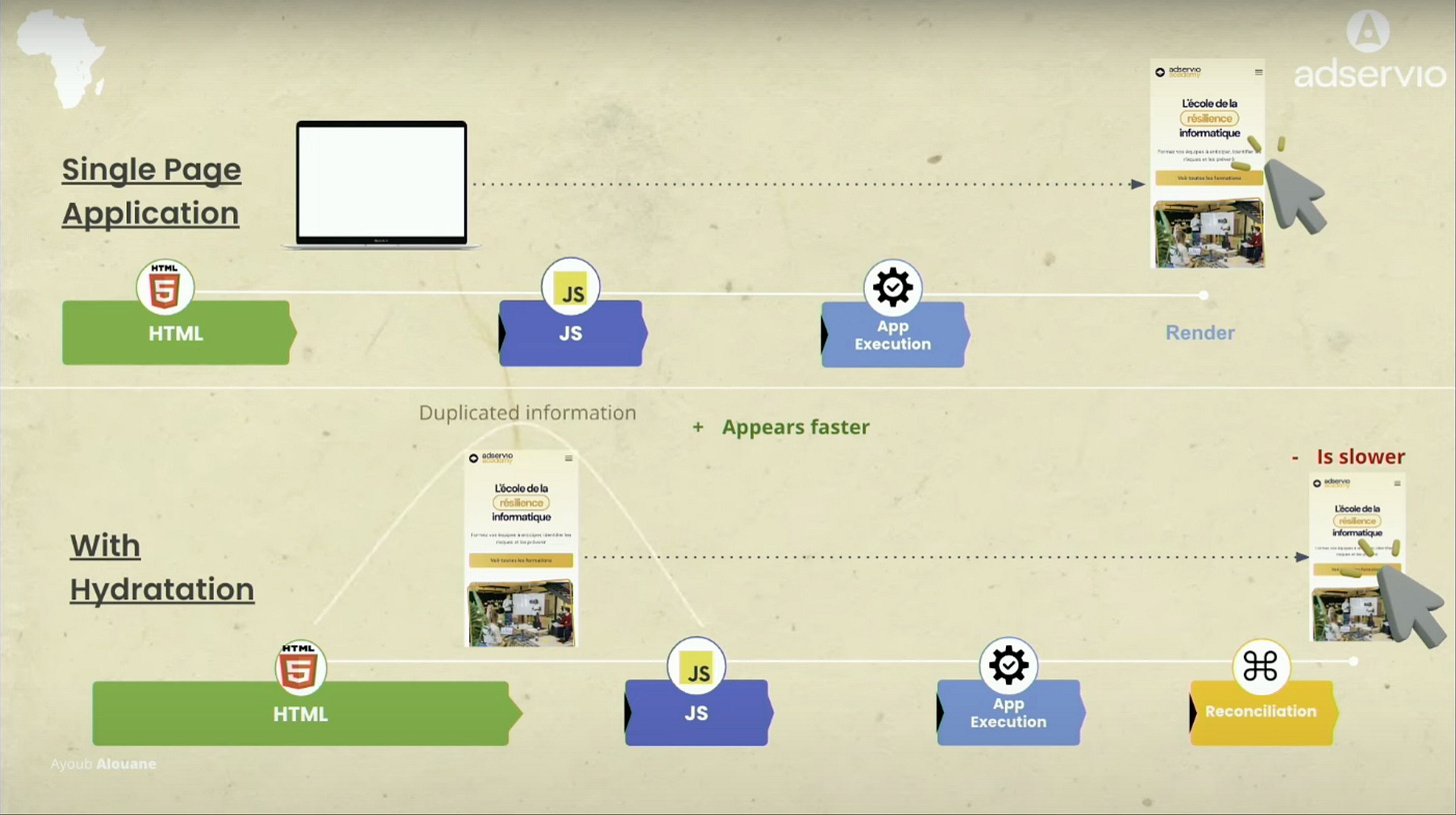 To fix the blank screen, Hydration was adopted and is used today in modern frameworks. Hydration allows for there to be UI on the screen while the JS is being downloaded. There is still a duration between the appearance of the page elements on the screen and the interactivity of them as we wait for the JS to be ready for use.